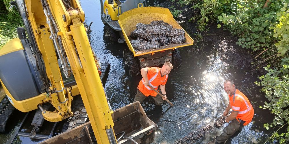 Damit die Gewässerunterhaltung hier perspektivisch effektiver und vor allem wirtschaftlicher wird, ist der Einbau von Steinwalzen (siehe Abb. 5 und 6) vorgesehen. Hierdurch wird eine dauerhafte und verlässliche Sicherung des Uferbereichs ermöglicht und die Fließgeschwindigkeit des Gewässers verbessert. Die zusätzlich geschaffenen Grünflächen dienen als Rückzugsort für Amphibien und Kleinstlebewesen.