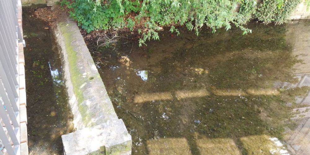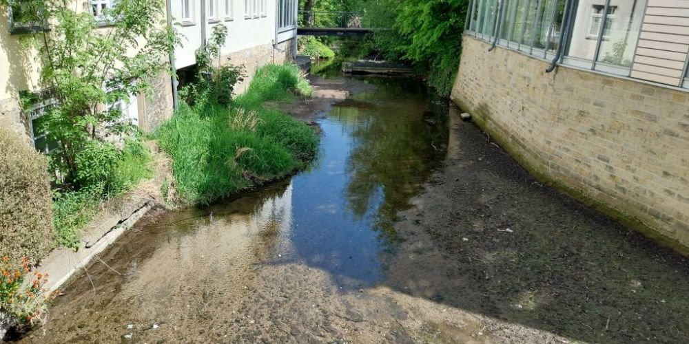 Vor Ort konnten die Teilnehmenden daher konkrete Maßnahmen unmittelbar in Augenschein nehmen, wie z.B. auch die Maßnahmen im Bereich der Langen Brücke. Aufgrund der hier vorherrschenden zu geringen Fließgeschwindigkeit sowie einer vorhandenen Sohlschwelle kommt es regelmäßig zu erheblichen Sedimentablagerungen im Bergstrom (siehe auch Abb. 3 und 4), die dann mittels Flussfege aufwendig zu beseitigen sind. Im Sommer erfordert die Gewässerentwicklung zusätzlich aufgrund des niedrigen Wasserdargebots (Niedrigwassermanagement) eine sorgfältige Planung, um die ökologische Funktion des Gewässers zu erhalten.